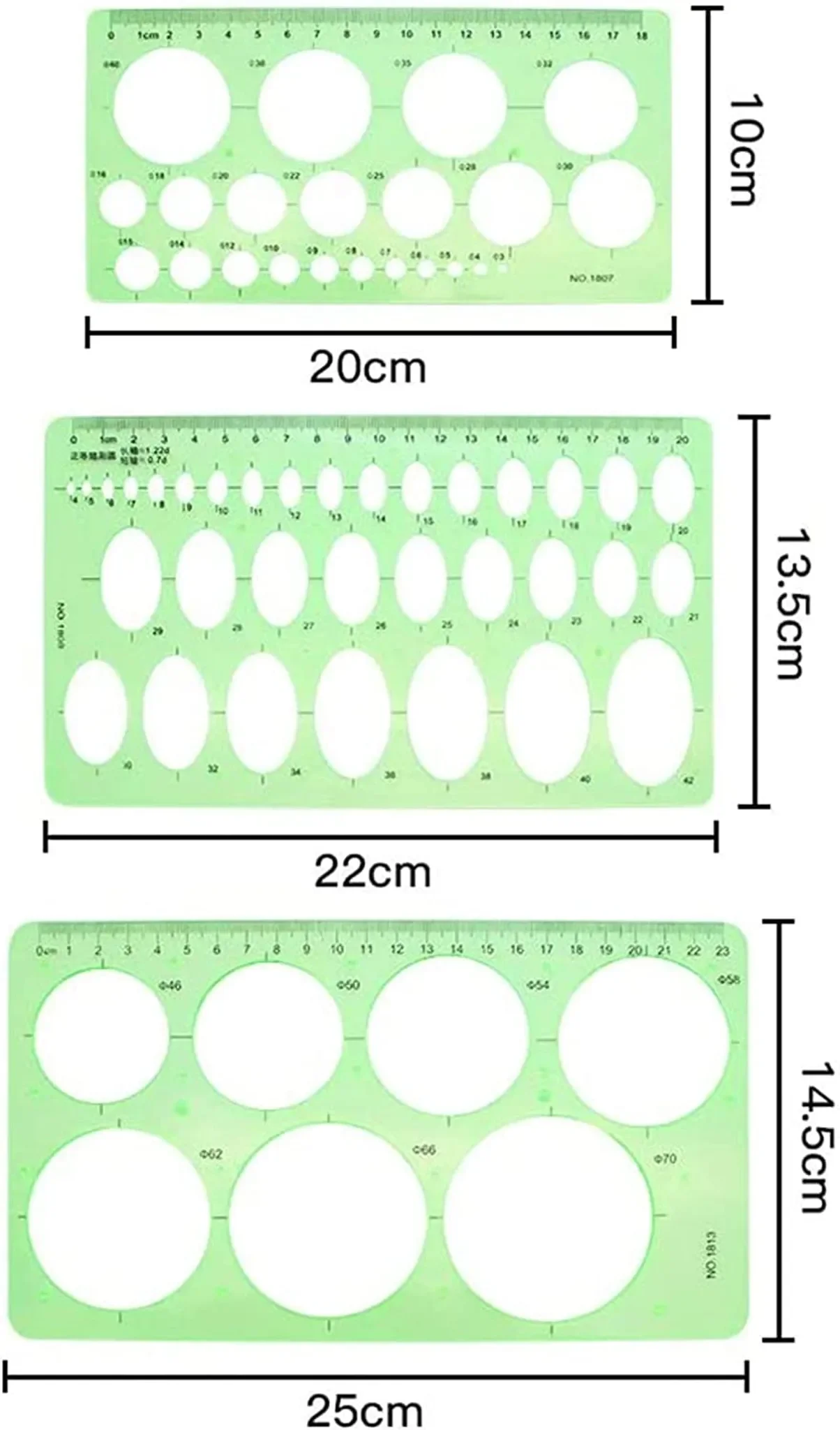 Die Schablonen verfügen über klare, langlebige Maßskalen in Zentimetern und lassen sich leicht mit Wasser reinigen. Die grüne Transparenz schont die Augen bei längerem Gebrauch. Mit verschiedenen Größen der Kreis- und Ovalvorlagen können Sie präzise Linien, Kreise und Kegel mühelos zeichnen.